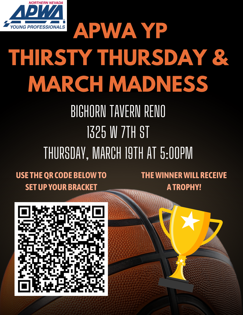 Join APWA Young Professionals for a Thirsty Thursday & March Madness social at Bighorn Tavern in Reno! Come network with fellow YPs, enjoy the games, and participate in our March Madness bracket challenge.